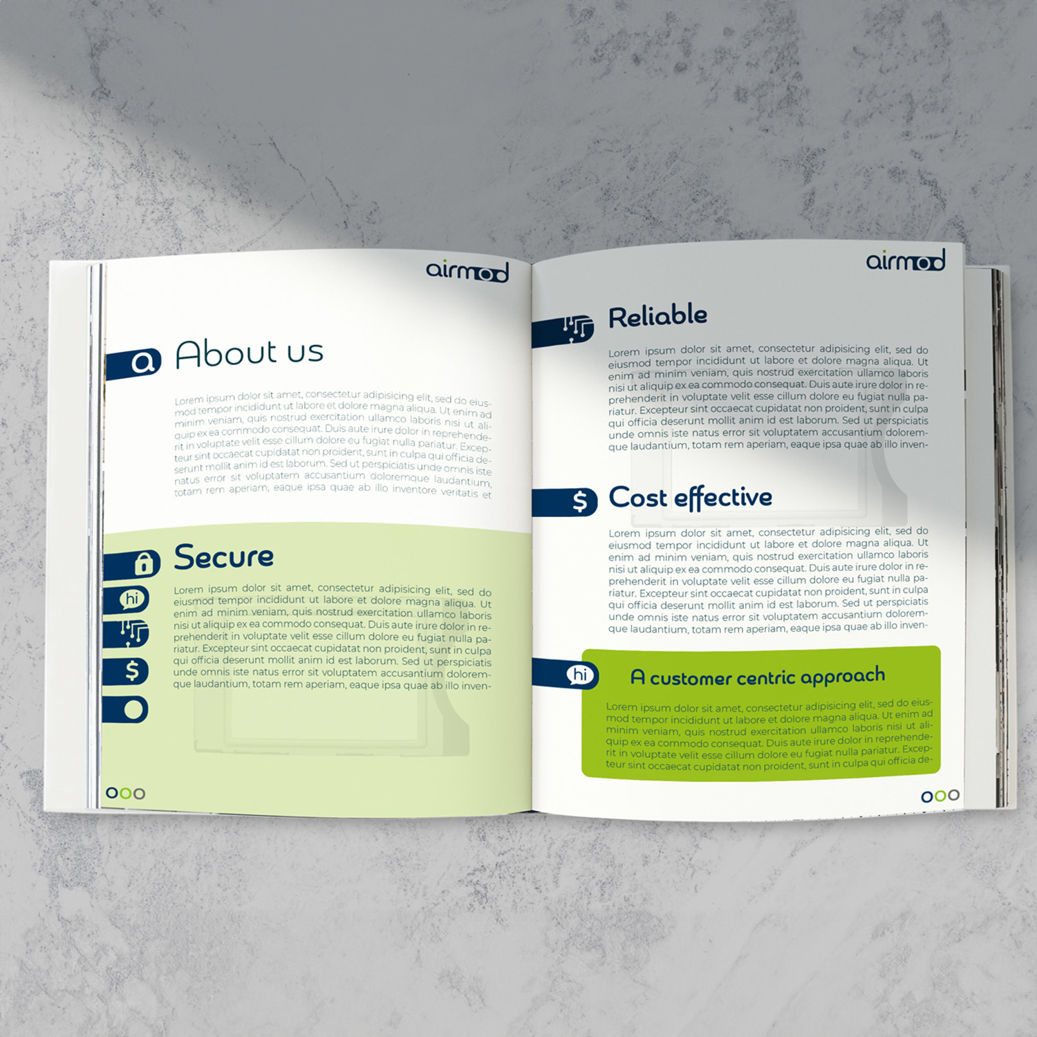 Li’dée était d’avoir un design aéré et sobre ainsi qu’une structure simple à manier. L’utilisation d’un fond blanc a donc été privilégié avec des photos principalement en niveaux de gris et une reprise des couleurs de la charte pour assurer la continuité de l’identité visuelle. Le modèle comprend 15 pages/dispositions ainsi que 3 pages d’icônes associées à la marque et 1 mode d’emploi.