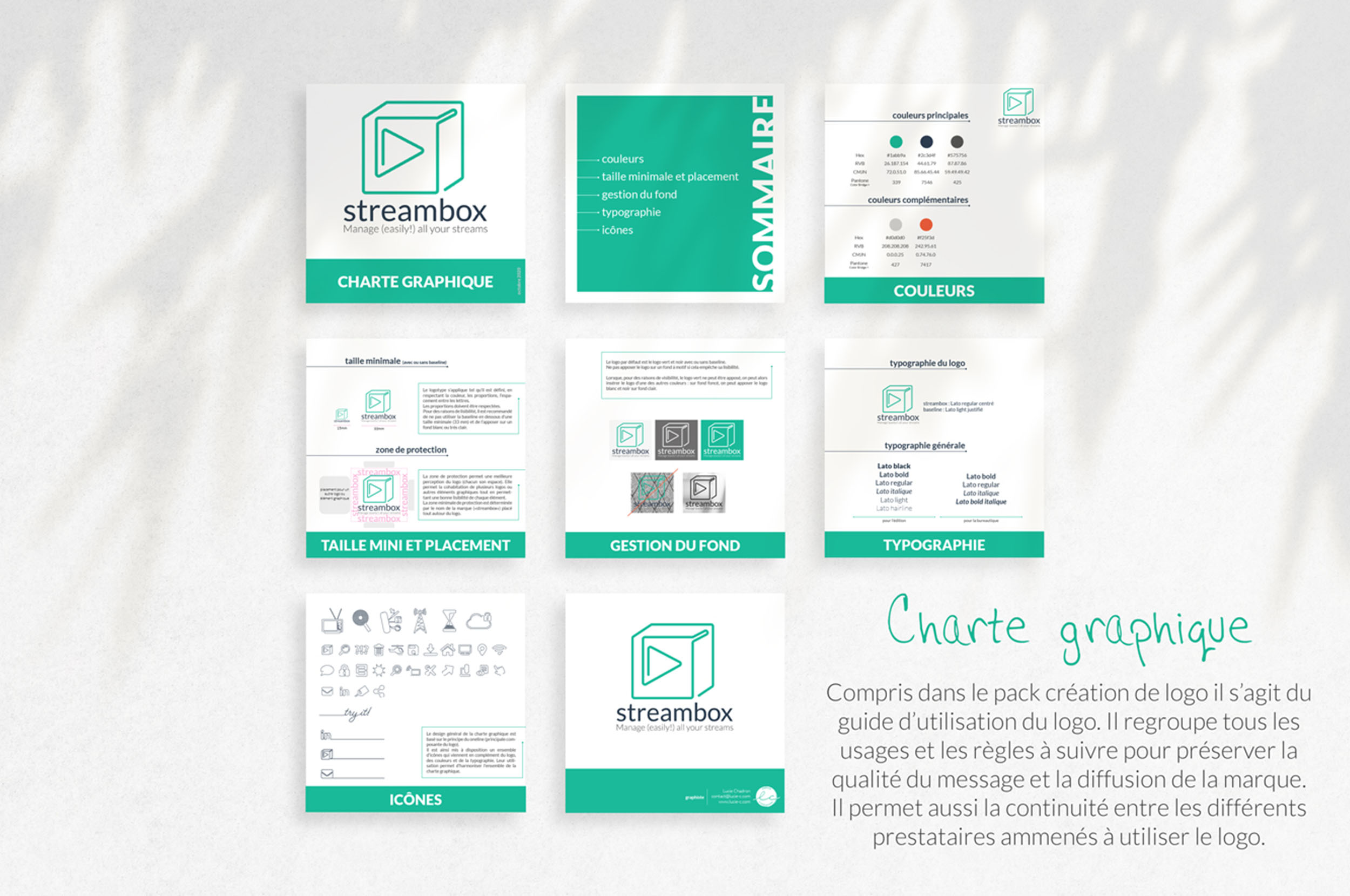 Le logo et la charte qui en ont découlés sont basés sur le concept du one line (une seule ligne continue) pour rendre compte de la simplicité de l’outil du client (une application web pour organiser et stocker les streams vidéos).