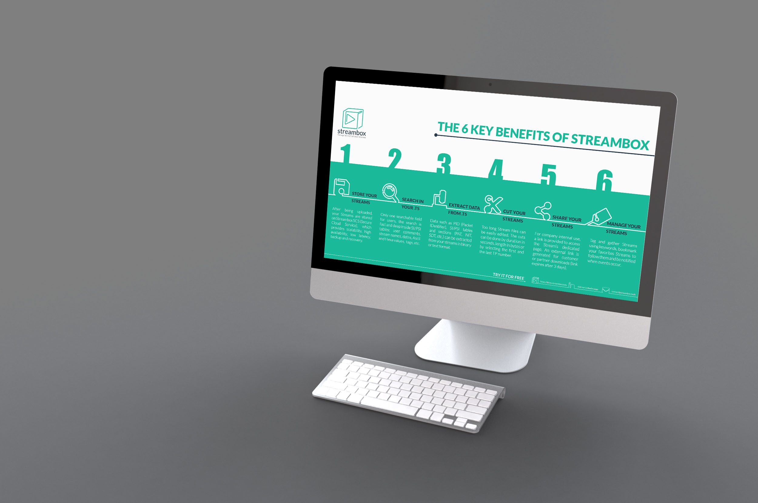 Le « 6 keys » (infographie) est un document qui a pour but de présenter en une image simple les 6 clefs du produit de manière épurée au profit d’un message plus visible. C’est un outil idéal pour une première approche commerciale ou une publication en ligne (Linkedin, Twitter, etc.).